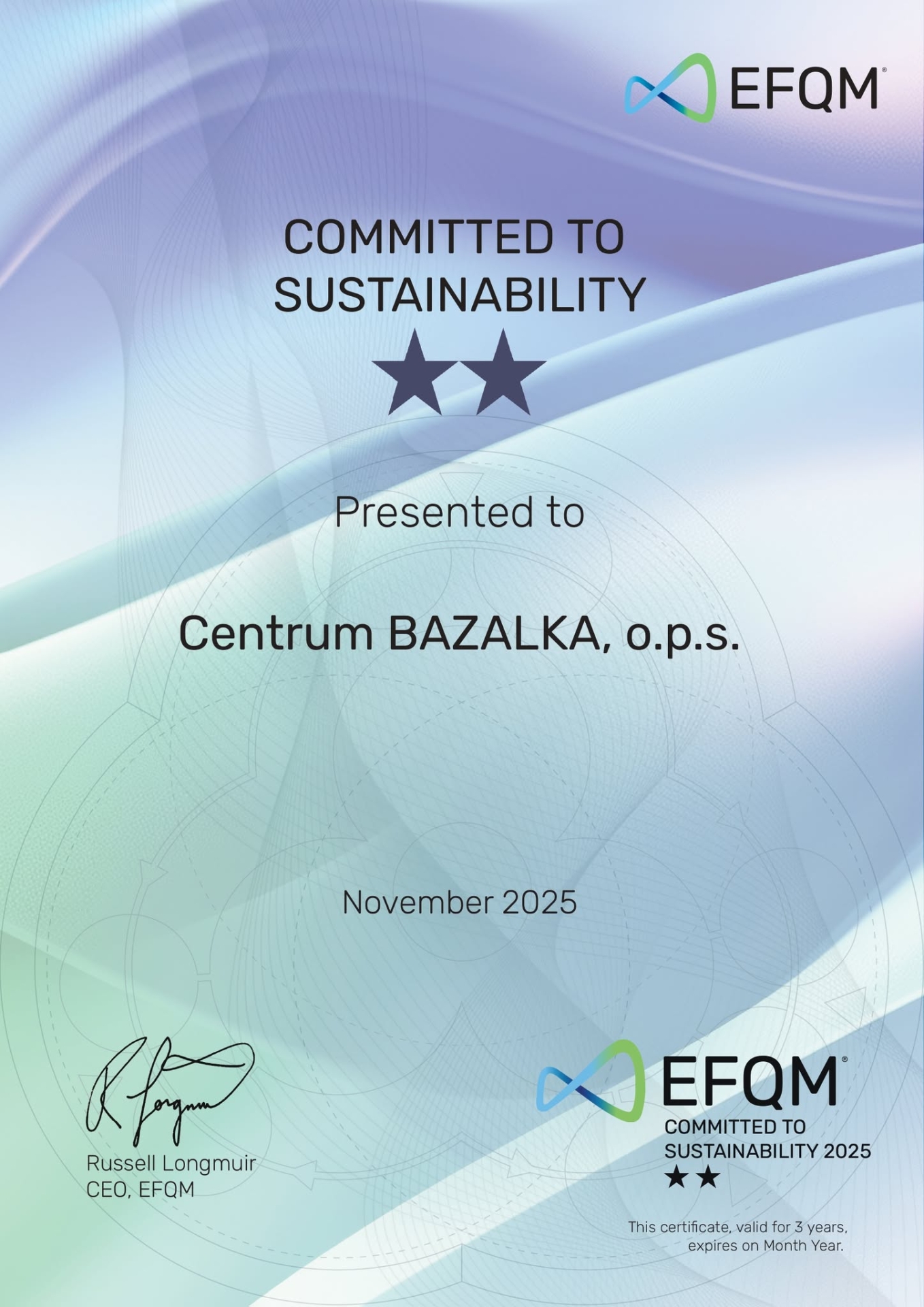 Centrum BAZALKA se v roce 2025 opět zapojilo do prestižní soutěže Národní cena za společenskou odpovědnost, kterou pořádá Rada kvality České republiky. S hrdostí oznamujeme, že jsme úspěšně obhájili mezinárodní certifikaci EFQM Committed to Sustainability se ziskem dvou hvězd.